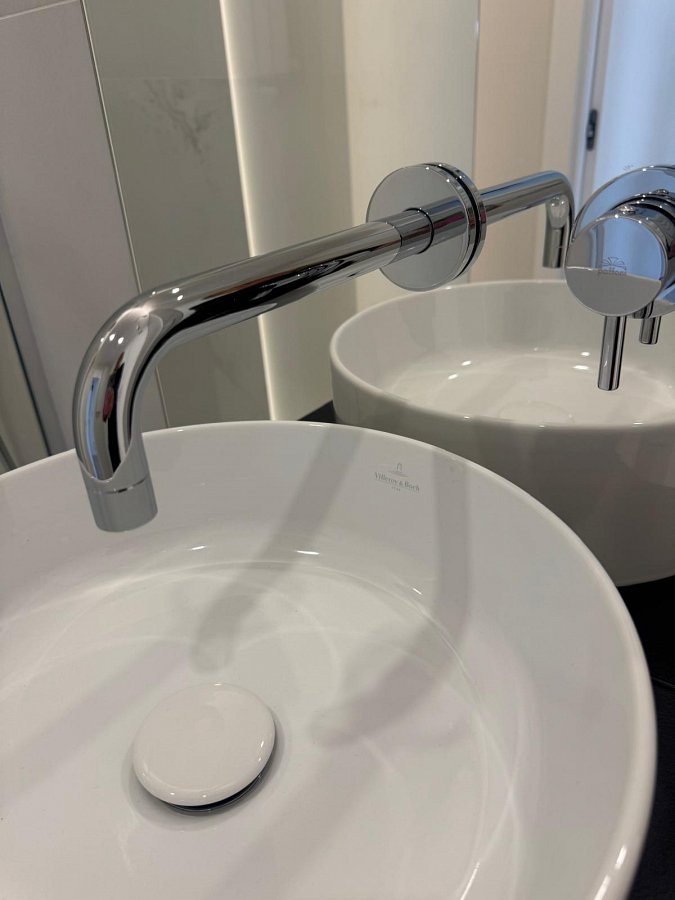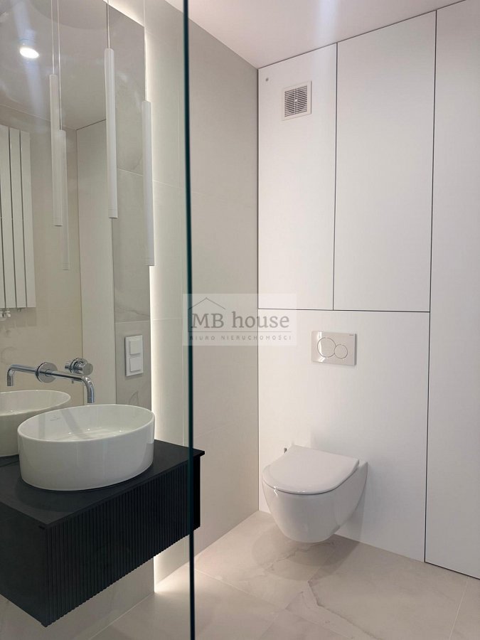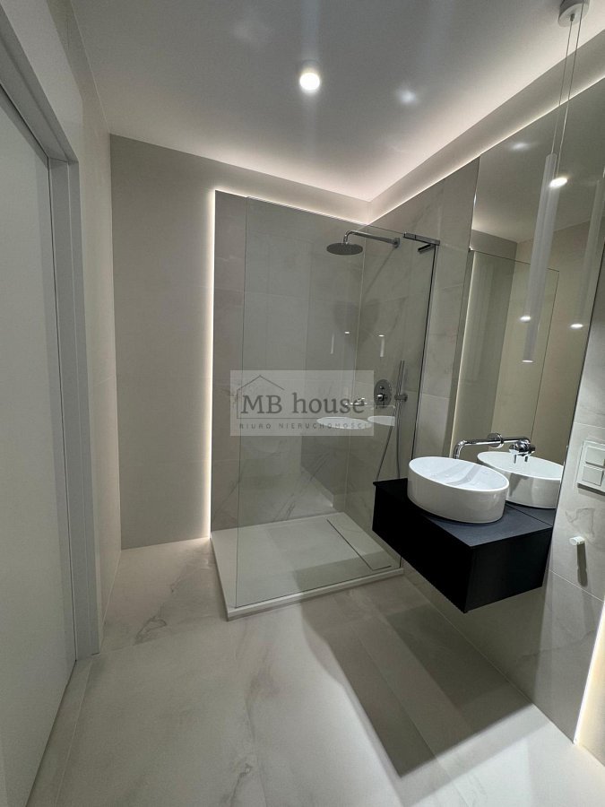 Łazienka – wykonana w standardzie TOP PREMIUM, z użyciem włoskich płyt oraz ceramiki Villeroy & Boch. Meble oraz zabudowa wykonana przez stolarza na indywidualne zamówienie. Zastosowano specjalne impregnaty na powierzchniach luster i kabiny prysznicowej, które zapobiegają osadzaniu się kamienia.